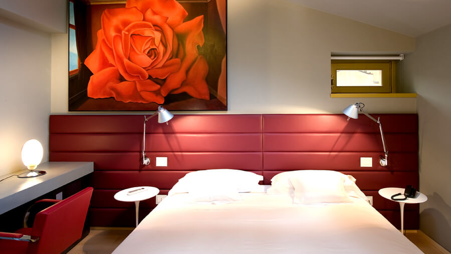 Camera doppia, con grande e confortevole letto king size, caratterizzata da un’atmosfera accogliente, toni e colori caldi, per un soggiorno all’insegna del massimo relax. Gli armadi a muro e gli altri elementi d’arredo (scrittoio, poltrona da lettura) sono pezzi unici di design, realizzati con materiali di qualità, per ottimizzare la qualità ergonomica e la percezione positiva dello spazio.